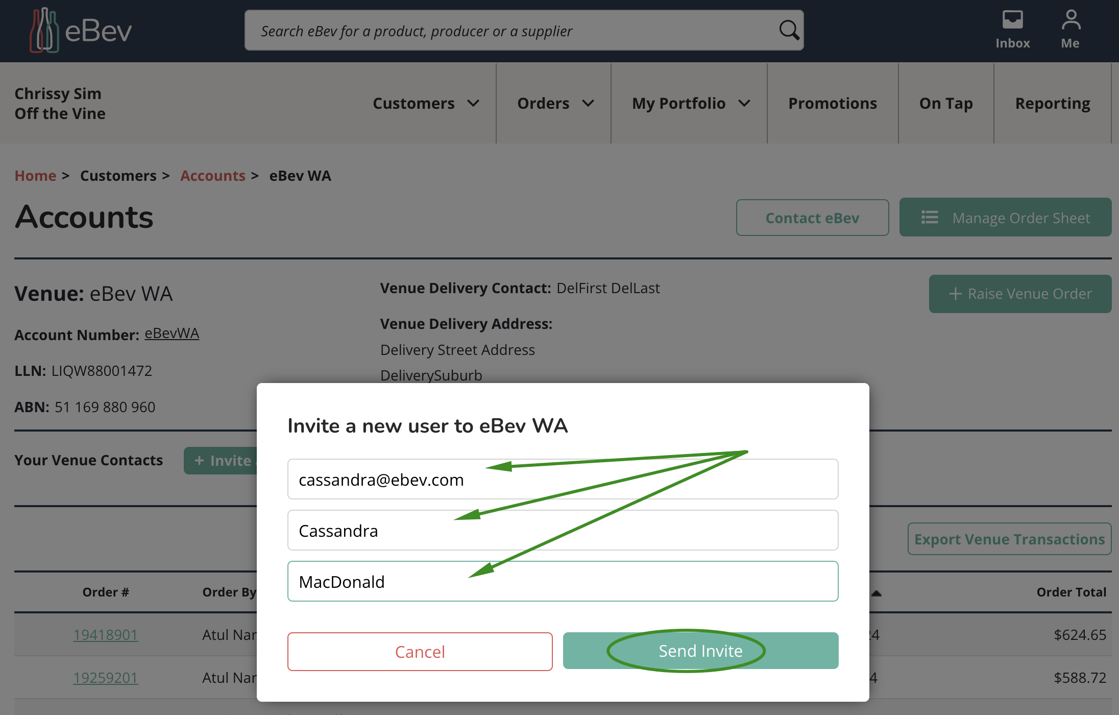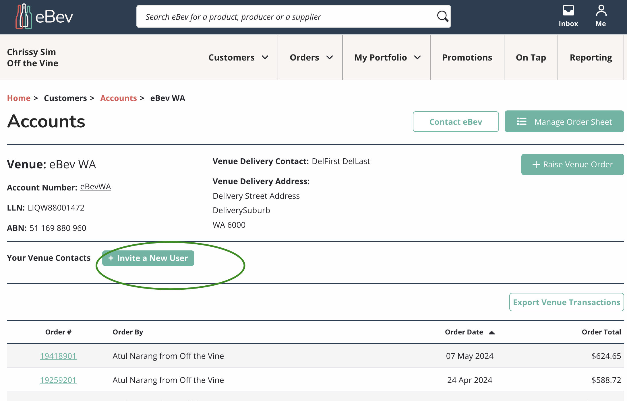 Now that you’ve set up your customer’s Quick Order Sheet invite them to access eBev and self service order. In your customers account select Invite a New User.