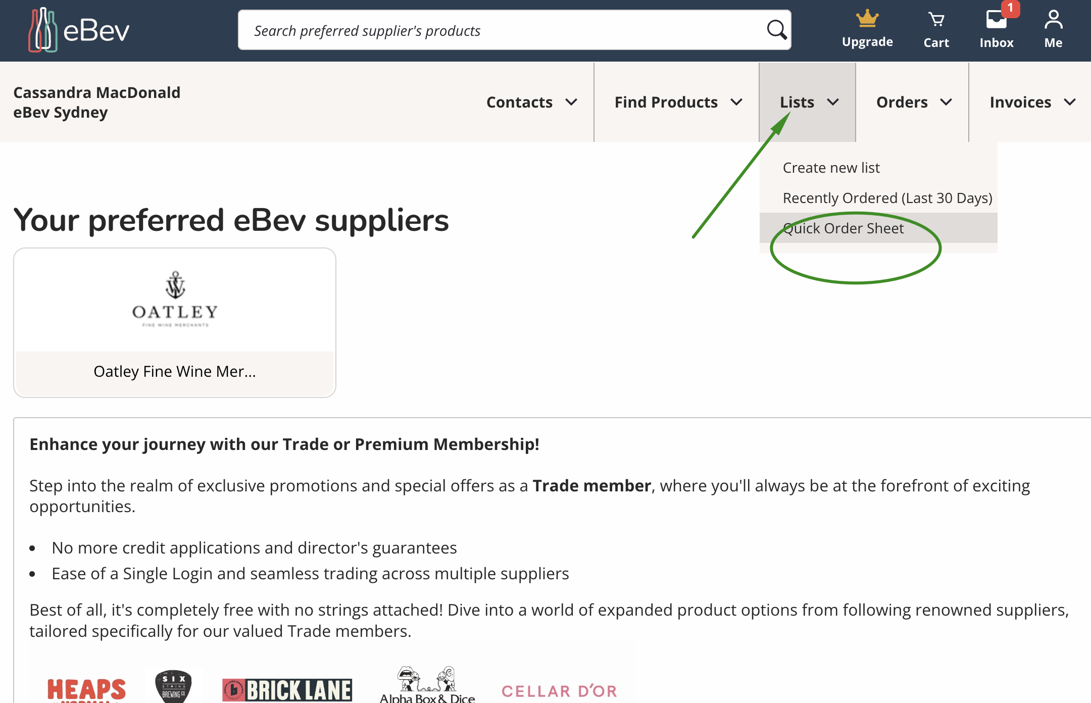 Once you have logged in your will see your dashboard with a navigation bar. Click on the Lists tab and scroll down to Quick Order Sheet.